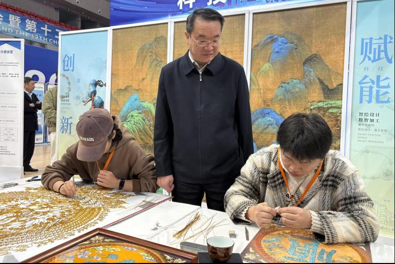 在湖北工业职业技术学院展区,艺术设计学院推出的“科技+非遗”系列成果成为全场关注的核心。展区以“传世匠心”“智绘设计”两大板块为核心,全面展现智能雕漆、掐丝工艺与绿松石首饰的创新融合。其中,借助数字化雕刻设备和3D扫描建模技术制作的绿松石首饰、雕漆产品,既保留了传统非遗技艺的精髓,又通过科技赋能创造出独特艺术效果。黄剑雄书记仔细察看展品后,对该校将现代科技与传统工艺相结合的创新实践给予高度评价,强调要进一步推动非遗技艺与科技创新深度融合,让传统文化在新时代焕发新活力。