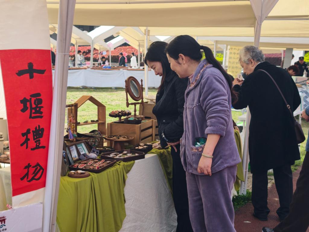 开幕式现场,樱花主题长廊与非遗特色打卡装置相映成趣,人流汇聚、氛围热烈。本次市集以“场景化、体验化、可传播”为标准,设置入口形象与流量留存区、核心非遗造物市集区、非遗活态体验手作区、品牌传播与人气聚集区四大功能模块,打造武当核心非遗、民艺生活美学、非遗美食、校企共创、校园创业五大特色专区,汇聚绿松石、掐丝珐琅、非遗大漆、金工首饰、剪纸、合香、陶瓷等多项传统技艺,实现“技艺展示+互动体验+产品销售”一体化呈现。